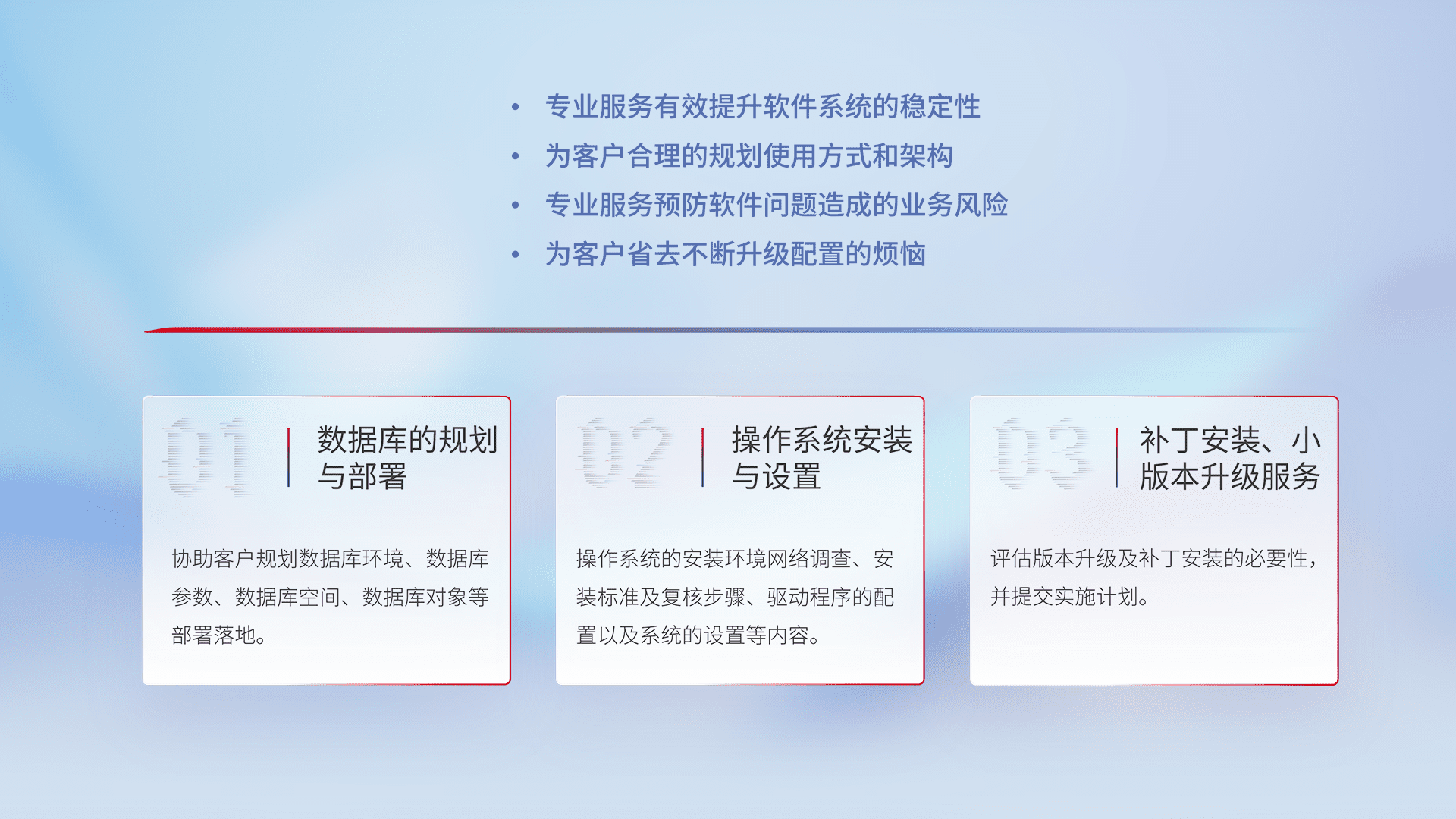 为客户提供软件规模升级、、、快速部署、、、、按需配置的专业服务,,从数据库的规划与部署到操作系统的安装与设置,,,再到补丁安装和小版本升级提供支持。。。